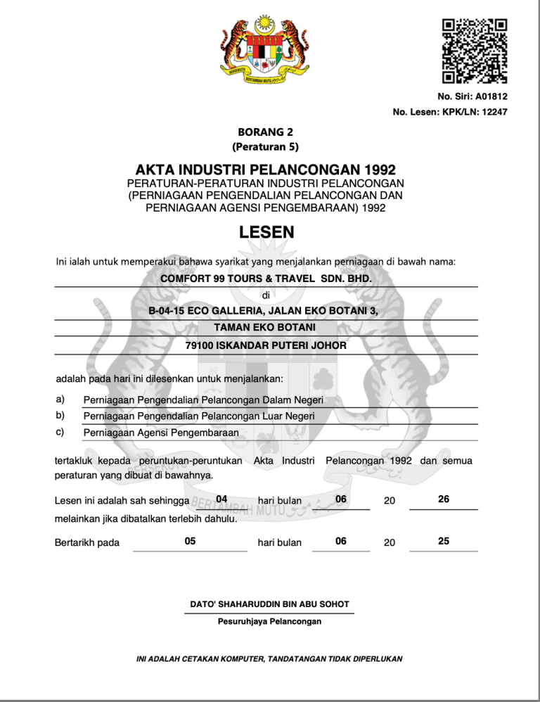 Comfort 99 Tours & Travel is a licensed tour operator registered under MOTAC Malaysia.